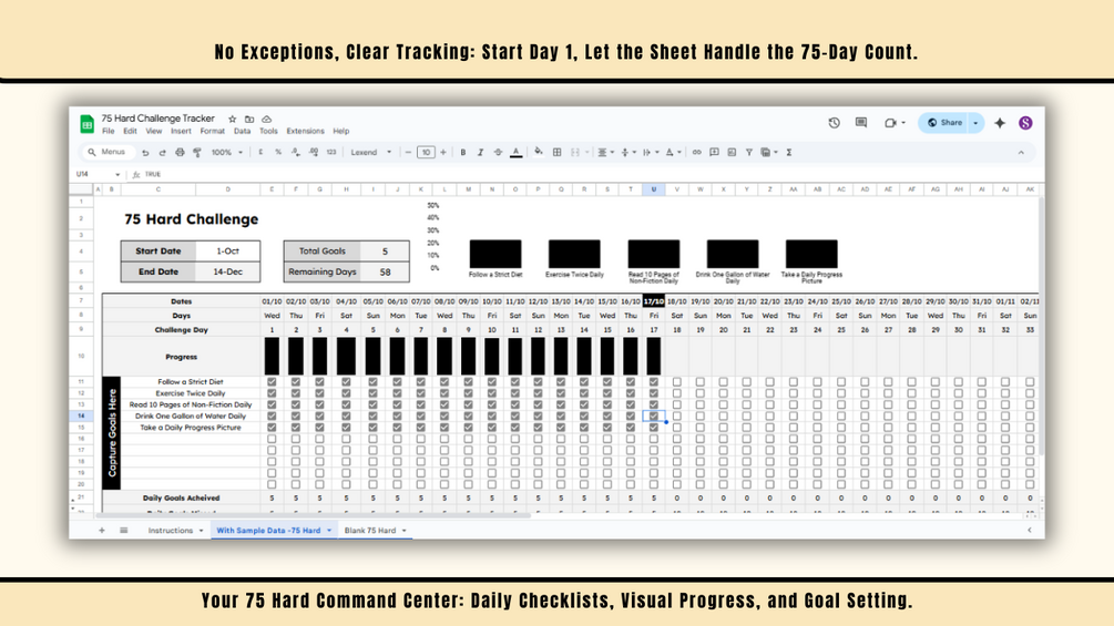 This Google Sheets template is your command center for consistency, designed to remove tracking friction and boost your accountability across the entire 75-day journey.